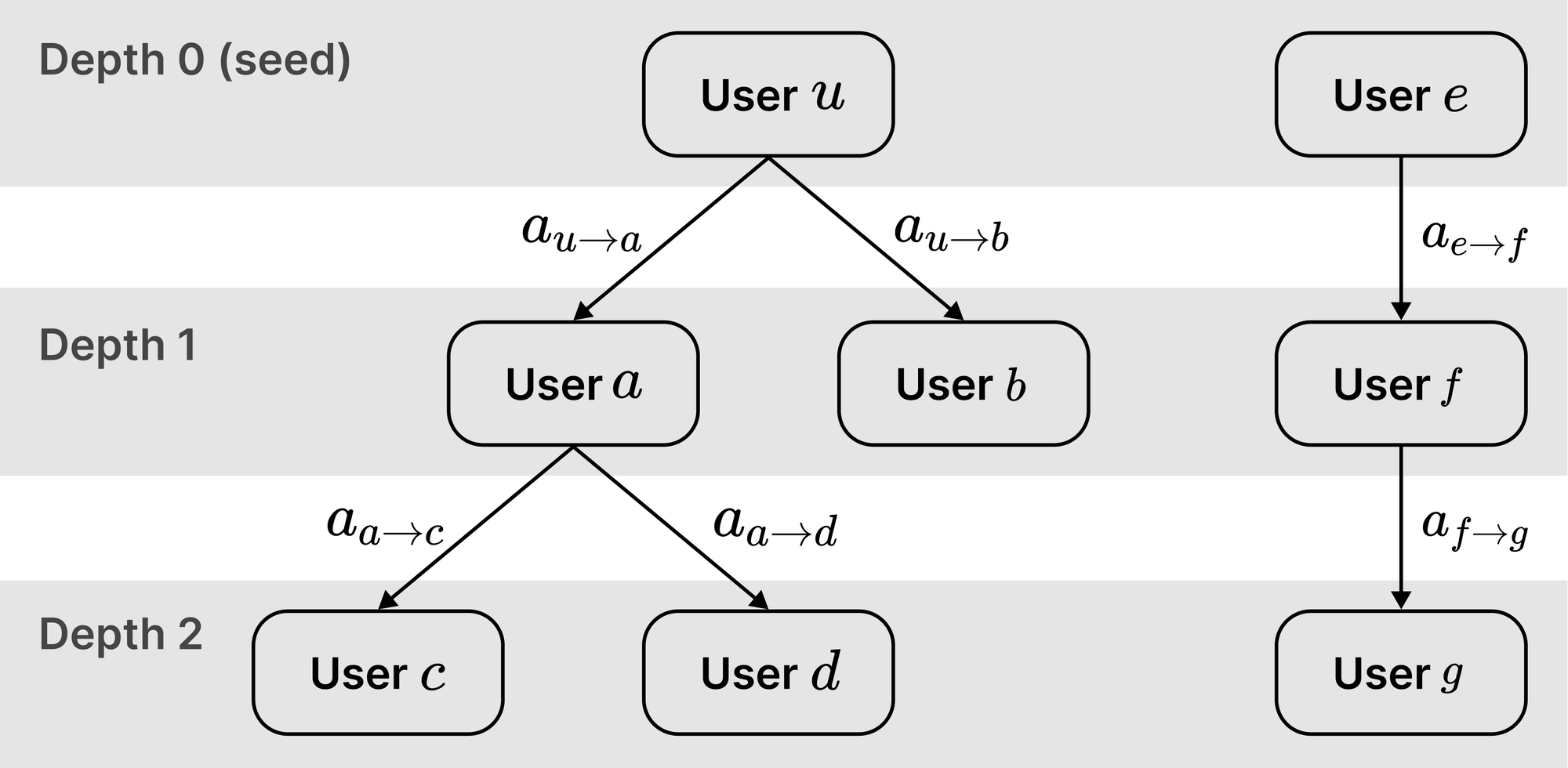 Delegations form paths from a seed \(u_0\) at depth \(0\) to user \(v\) at depth \(d(v)\):